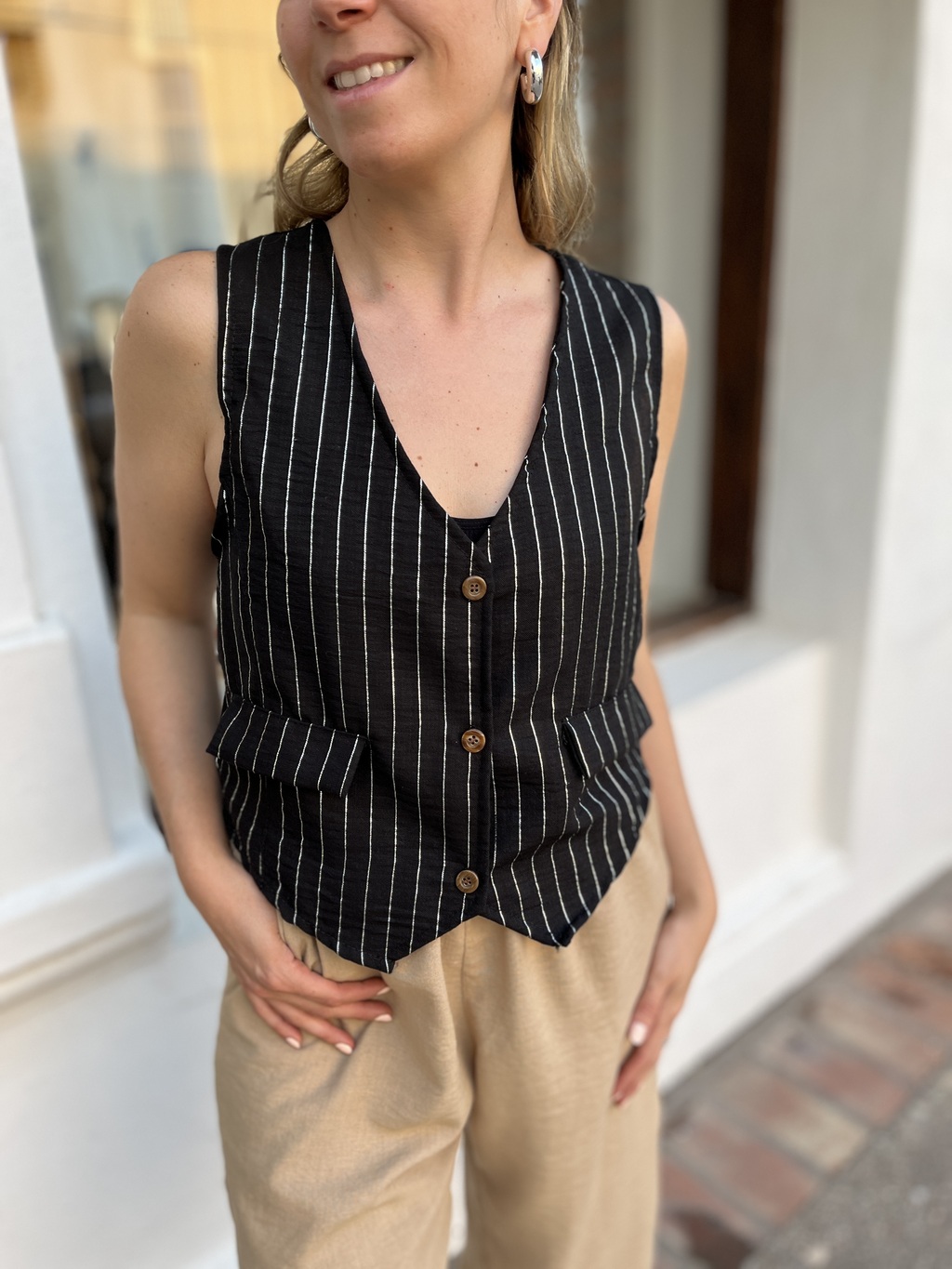 Chaleco de lino rustico con rayas, super lindo Liviano y fresco., chequear bien las medidas. Modelo con pico adelante un poco mas largo, atras tienen las mismas medidas.