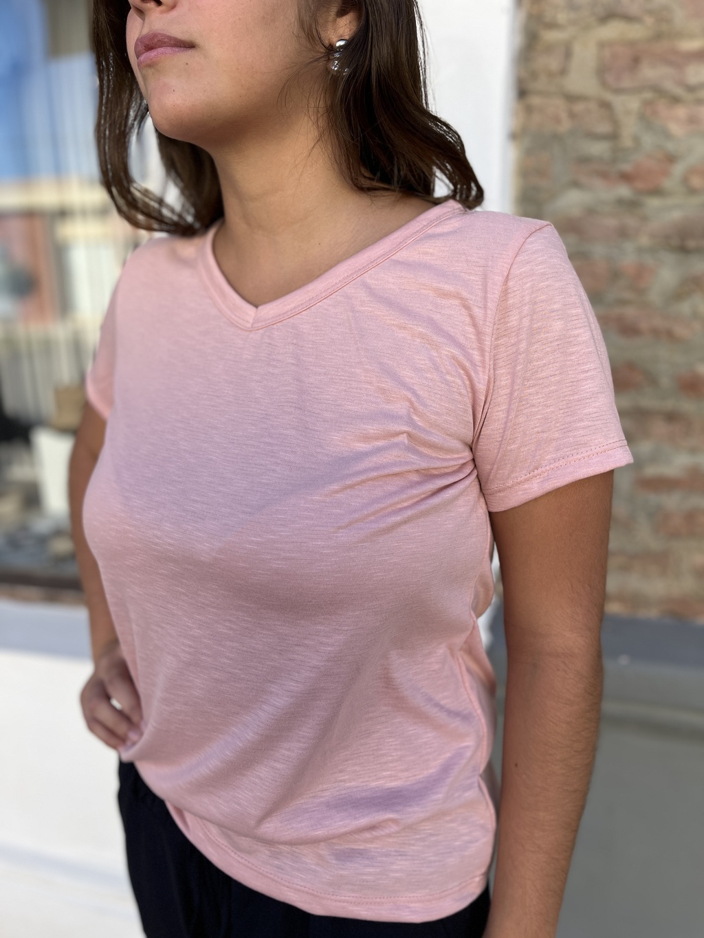 Remera de algodon flame, escote VE. Es un modelo clasico, largo convencional. Podes elegir tu talle habitual. Te dejamos las medidas de la prenda en superficie plana para que puedan comprar tranquila. Recorda que el algodon cede.